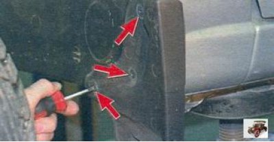 Removal and installation of mud flaps and fenders of the front wheels Kalina