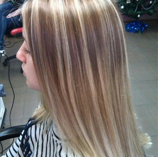 fine and smooth, straightened and silky hair, light brunette with blonde hair h.