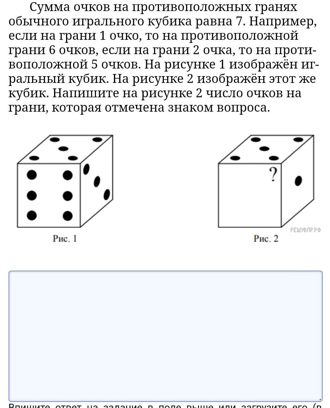Сумма очков на противоположных гранях обычного игрального кубика равна 7. Наприм